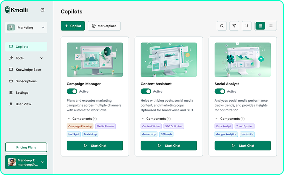 From internal copilots to public-facing AI products — Knolli adapts to your vision and helps you monetize it.